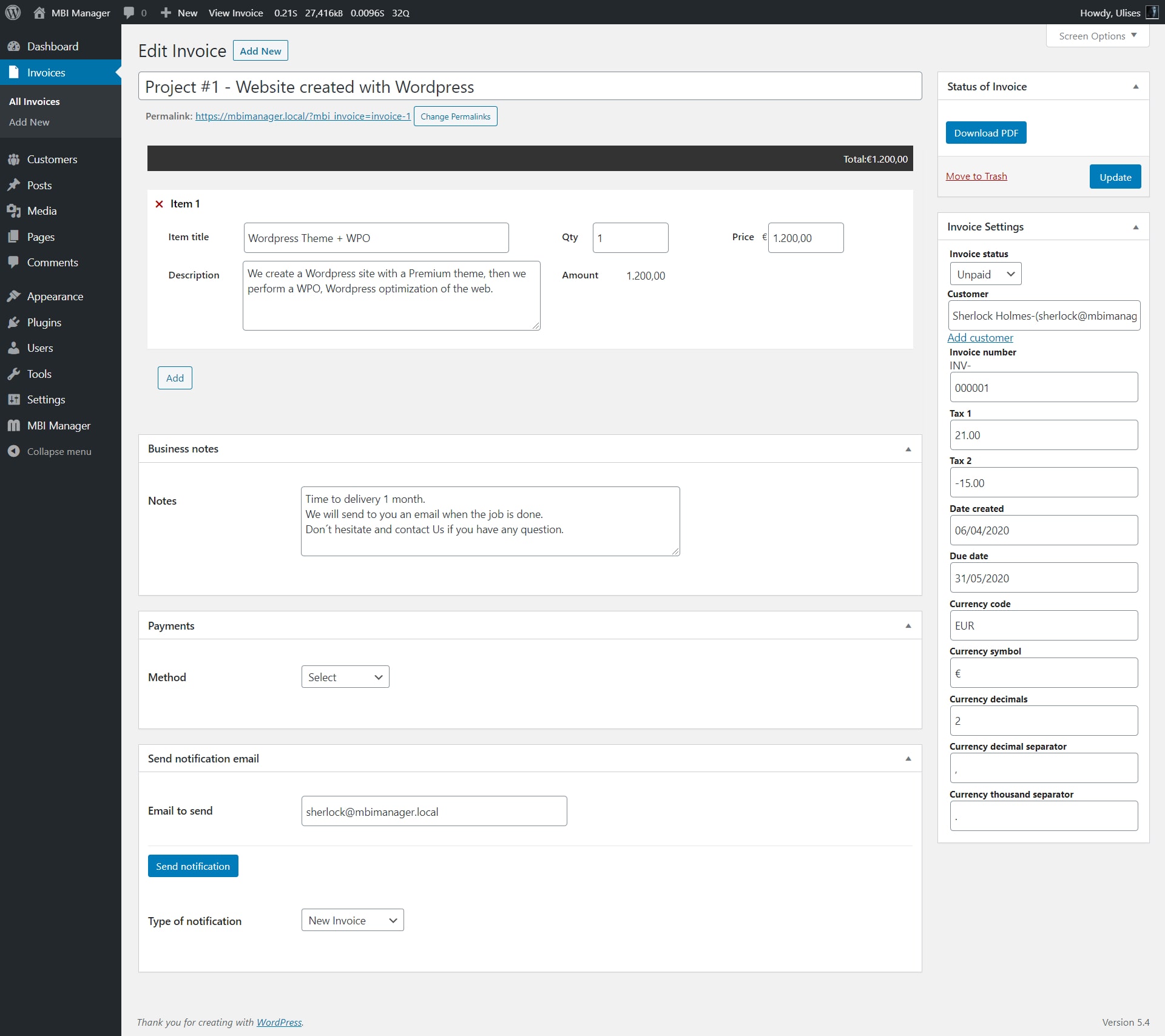 Invoice status, customer, number, tax1, tax2, date created, due date.