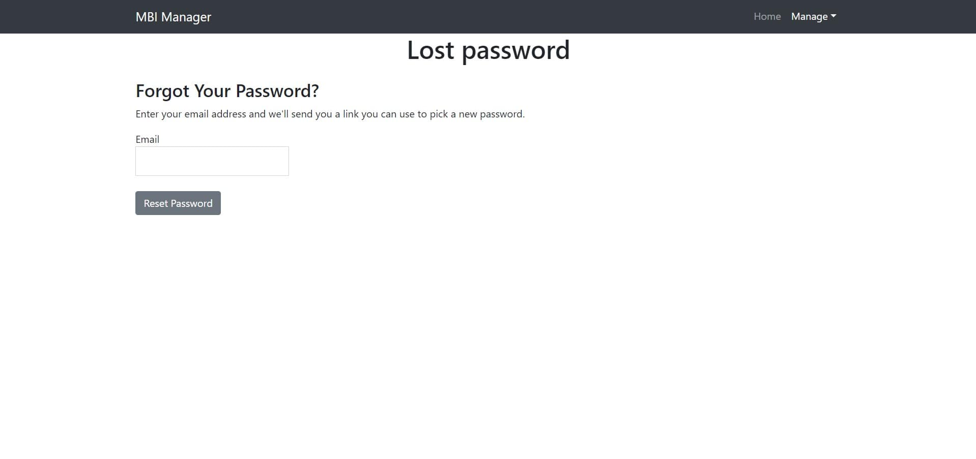When Mbi Manager is installed, it will create a new page with a shortcode [mbi-manager-lost-password] This page is needed to display a form to retrieve password for the user.