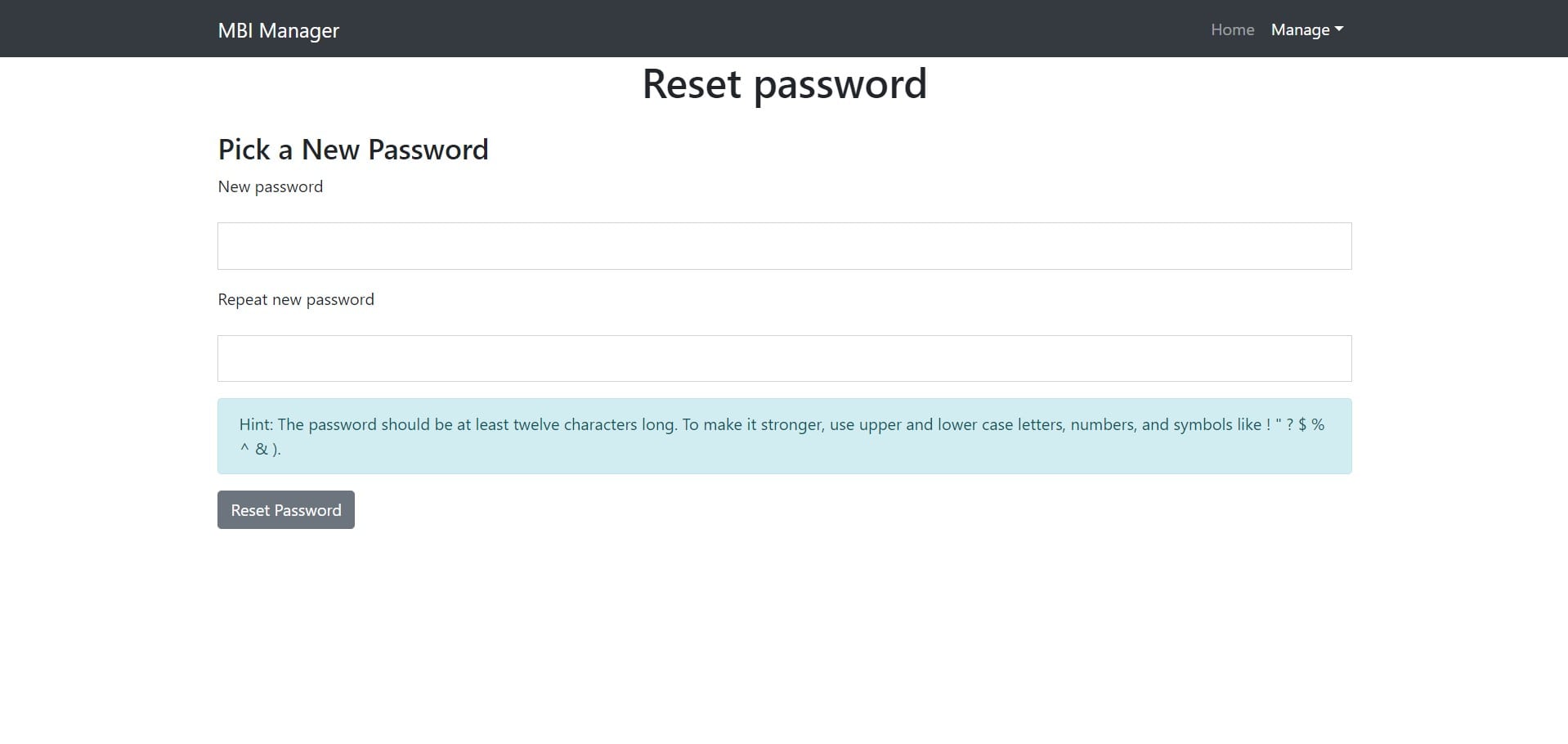 When Mbi Manager is installed, it will create a new page with a shortcode [mbi-manager-reset-password] It is recommended that this page is not visible to users, it will be accessible when the user requests a password change, and it will be accompanied by a url with parameters.